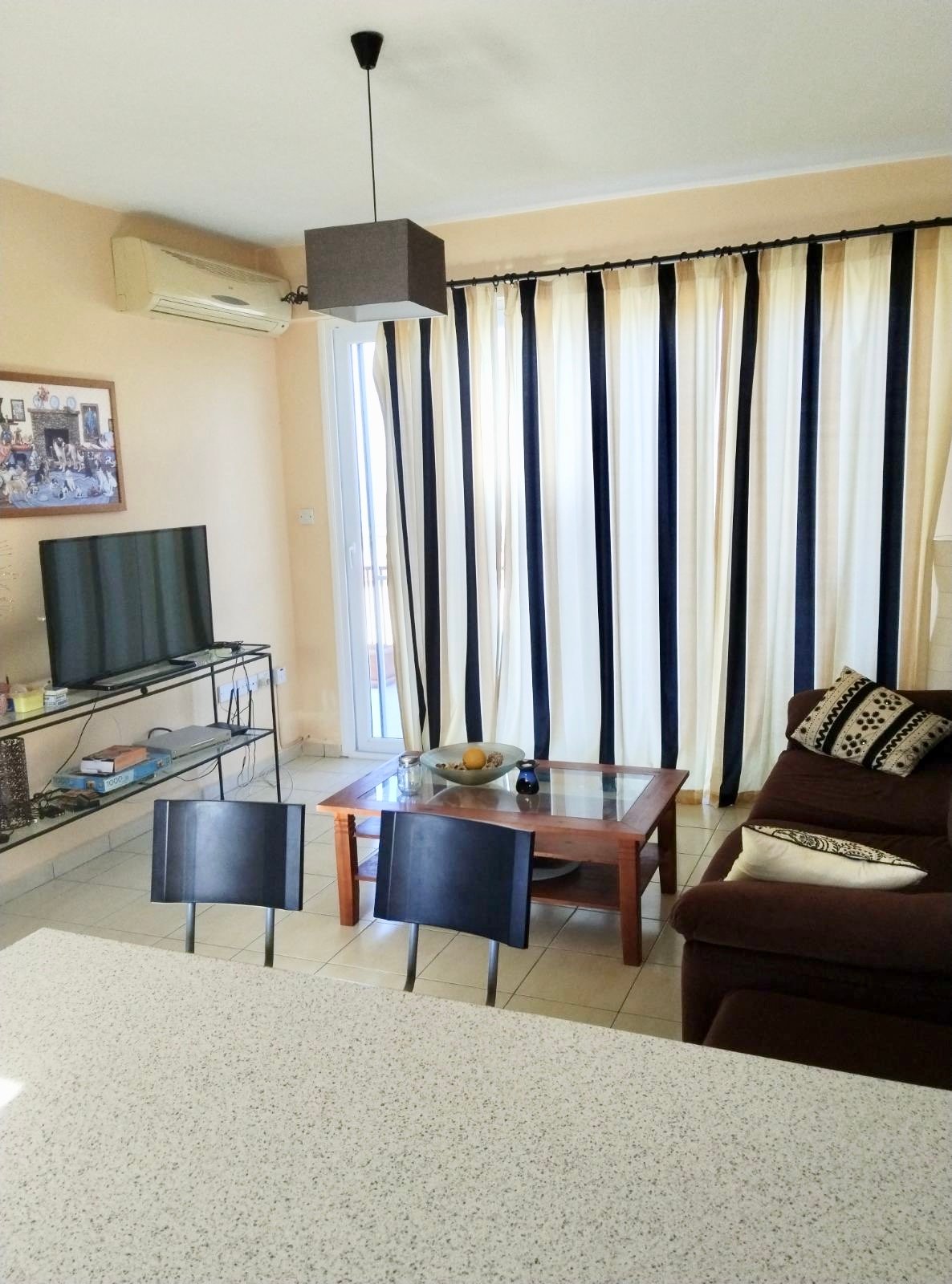 The apartment is fully equipped and designed for comfort, featuring a spacious living area, modern kitchen, two bathrooms, and a large private terrace perfect for outdoor dining or enjoying the sunset.