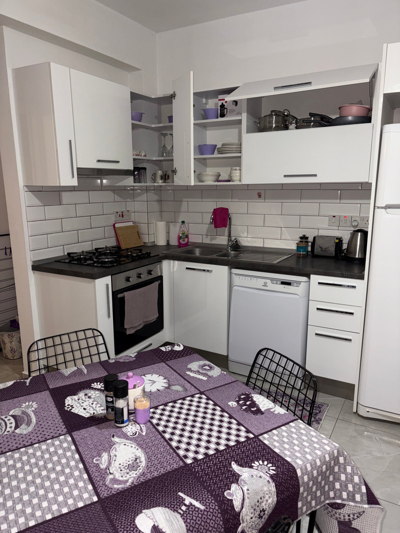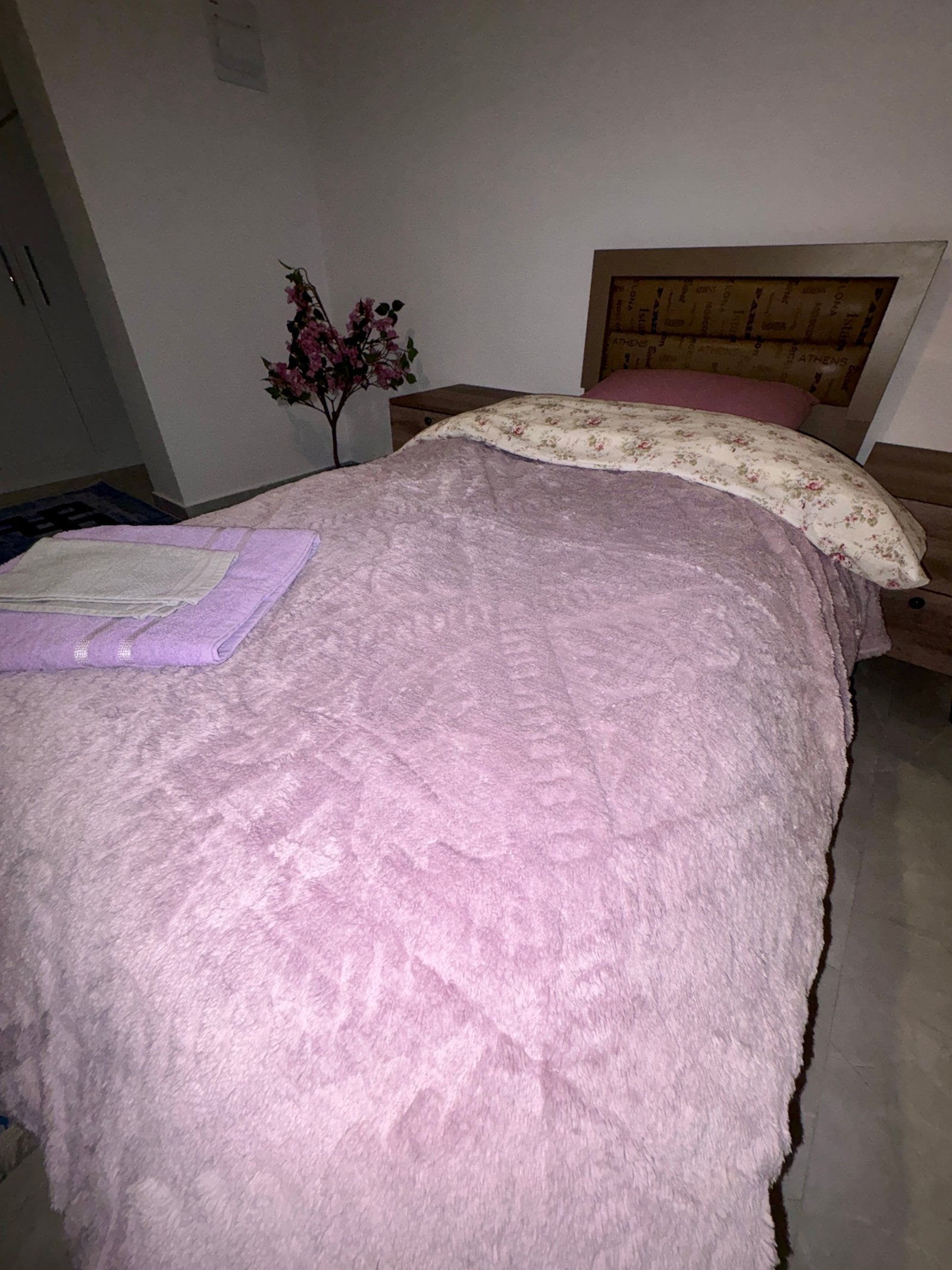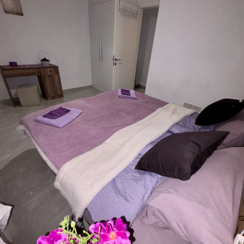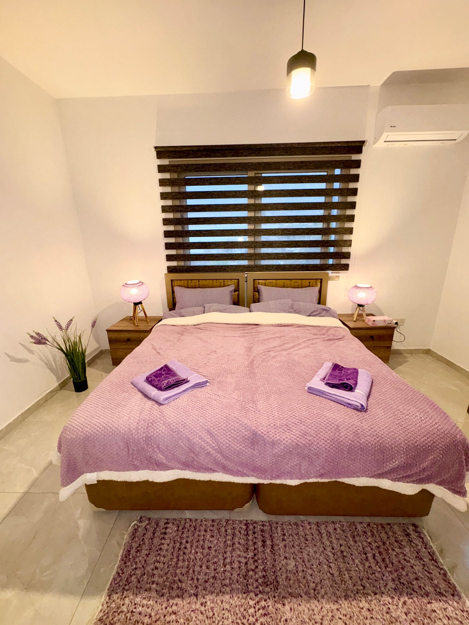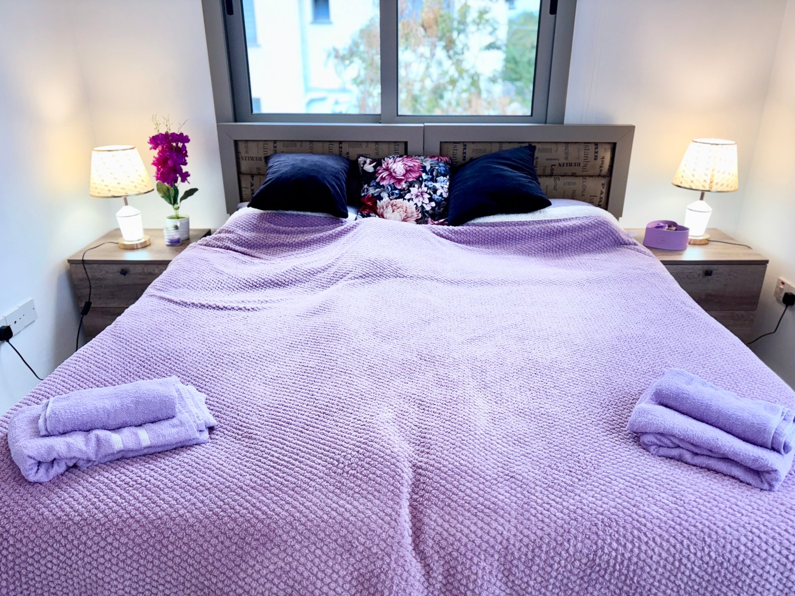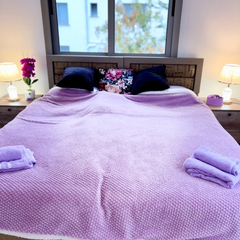 The apartment is fully equipped with: fridge, washing machine, dishwasher, toaster, kettle, coffee maker, iron, hairdryer, and air conditioning (cooling & heating). 🌿💜🌊